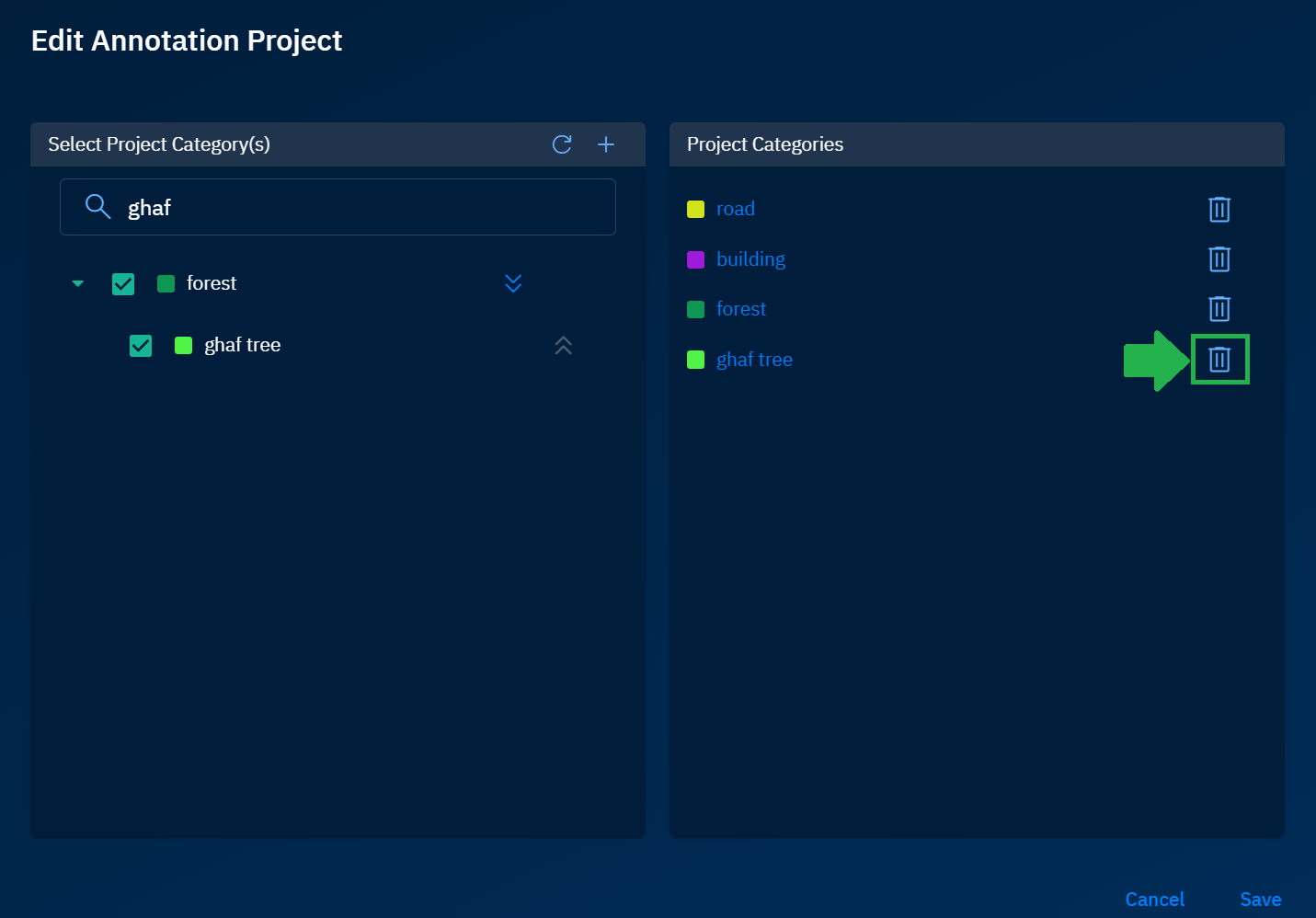 - In the Edit Annotation Project dialog box, locate the category you want to remove, and then click the Delete icon in the Project Categories area.