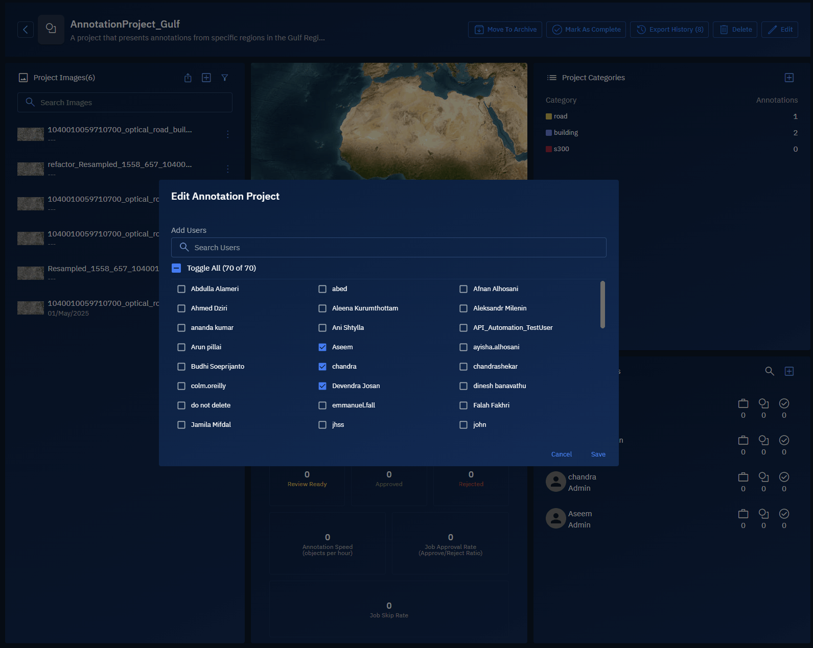 5. In the Edit Annotation Project dialog box, type the name of the member or members that you want to add in the Search field, clear the check-box of the member or members to remove from them from the annotation project, and then click the Save button.
