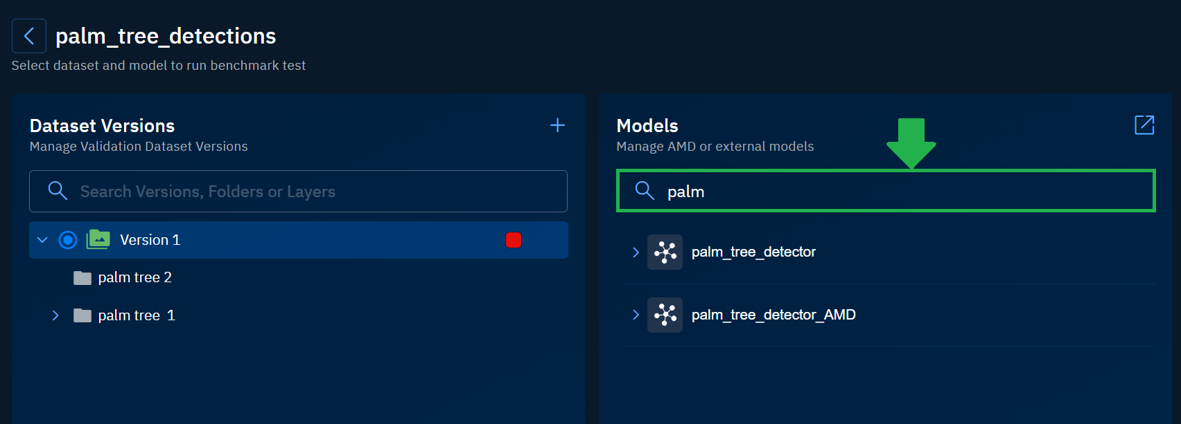 In this section, you will learn how to select an AI model to test and validate your dataset version.