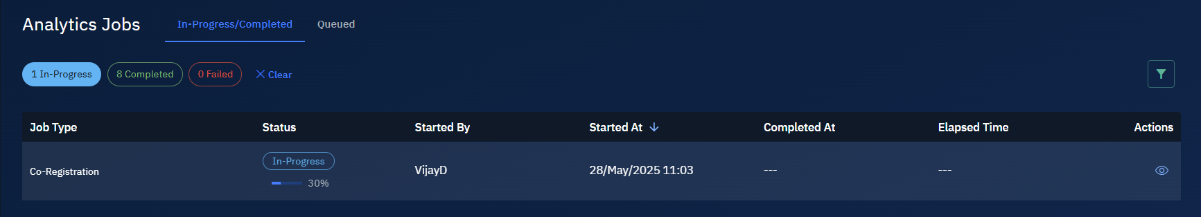 Click the Data module, select the Analytics sub-module, and then view the job progress in the In-Progress/Completed tab.