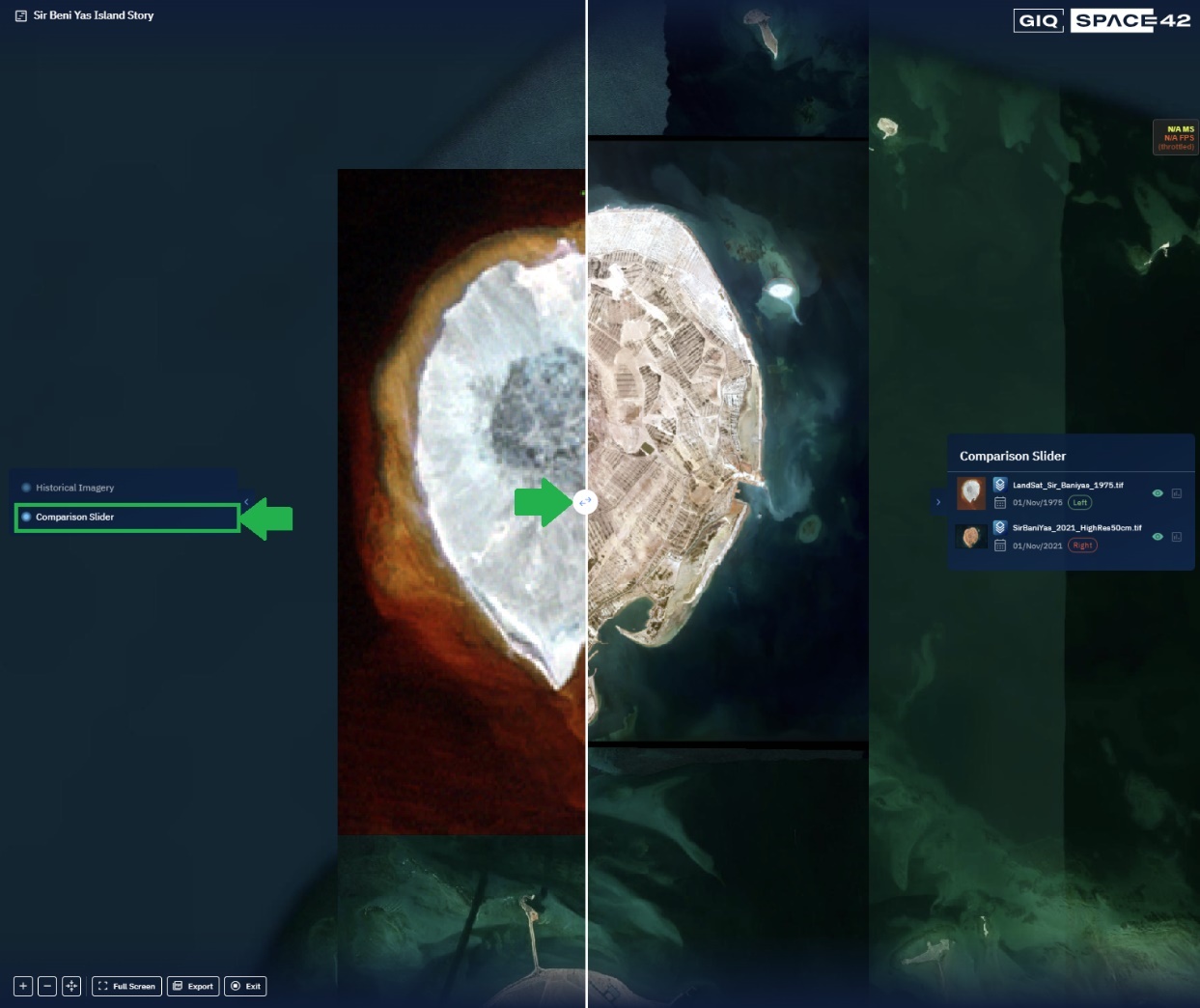 - Comparison Slider: Create a story with only two images (from the two different dates or timestamps) to compare a specific AOI.