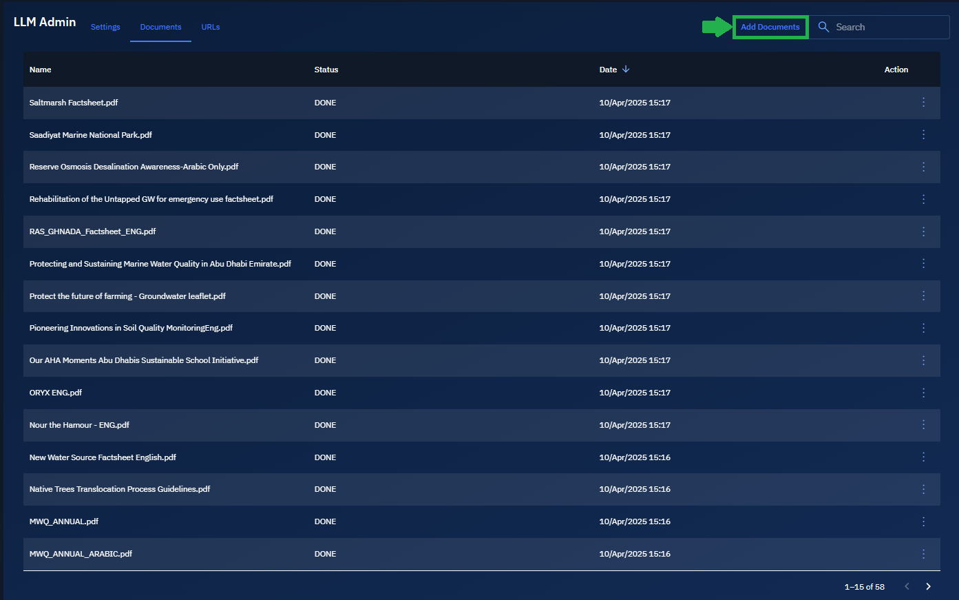 On the LLM Admin page, click the Documents tab and then click the Add Documents button to upload documents to the platform.