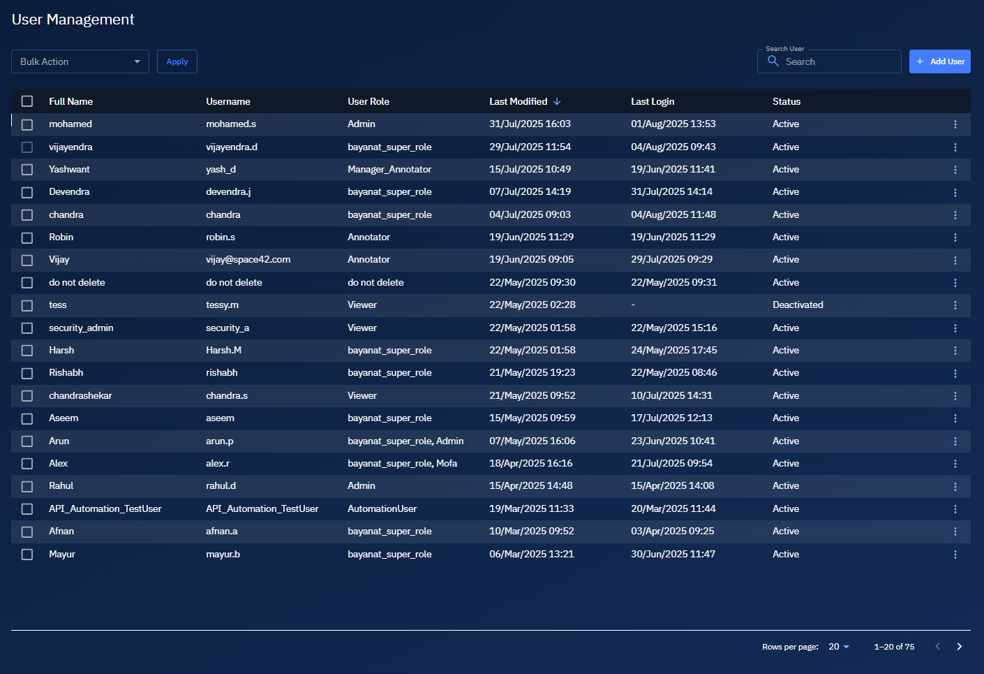 The User Management sub-module of the Admin Panel allows you to create, edit, and manage user accounts. This includes controlling user access, managing authentication, and performing bulk operations.